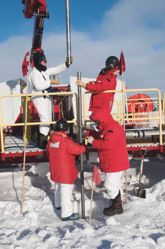 To answer that question, Tulaczyk needed to under-stand the movements of the Whillans ice stream and its relation to the lake beneath. He’d have to embed instruments in the ice and deploy them on the surface. For help, Tulaczyk turned to UCSC colleagues, seismologist Susan Schwartz and engineer Daniel Sampson. Along with veteran driller Dennis Duling, of the U.S. Antarctic Program, the team spent two backbreaking summers drilling six boreholes into the Whillans ice stream.