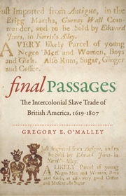 His multi-award winning book, Final Passages: The Intercolonial Slave Trade of British America, 1619–1807, solved a riddle from O’Malley’s doctoral studies. Although ships from Africa delivered thousands of slaves to a few main American ports, no one knew how slaves ended up in so many other places—from the northern British colonies to silver mines in Peru.