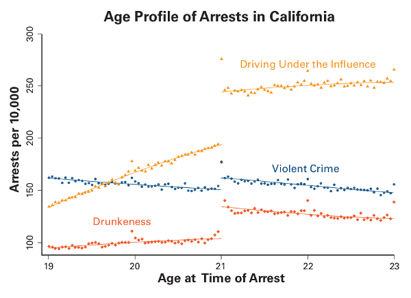With this unique dataset in hand, Dobkin and colleagues performed their discontinuity analysis. The results were dramatic. Arrests, hospitalizations, and deaths all spiked with the onset of the legal minimum drinking age. He found people were 25 percent more likely to get a DUI and 9 percent more likely to die. Most of this was related to cars—either being caught driving under the influence or having an accident. In fact, you can chart the driving skills of every age group as they get more comfortable behind the wheel and their rate of deaths related to driving decreases. When they hit 21, as a group, they essentially lose two years of improvement and their numbers worsen to match those of 19-year-olds.