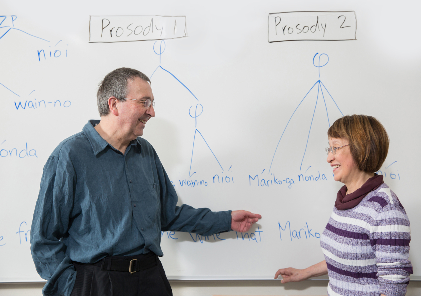 Linguists have generally studied these two dimensions of language separately, but there is growing interest in how they intersect, said Junko Ito, UC Santa Cruz professor of linguistics. Syntax provides the basic structure, the traditional thinking goes, and prosody defines how it sounds in its spoken version. Yet while the word groupings in syntax differ from the emphasis groupings of prosody, they are clearly related, said Armin Mester, Ito’s close collaborator and UCSC professor emeritus of linguistics. “The question is, how do these two different structures link?”