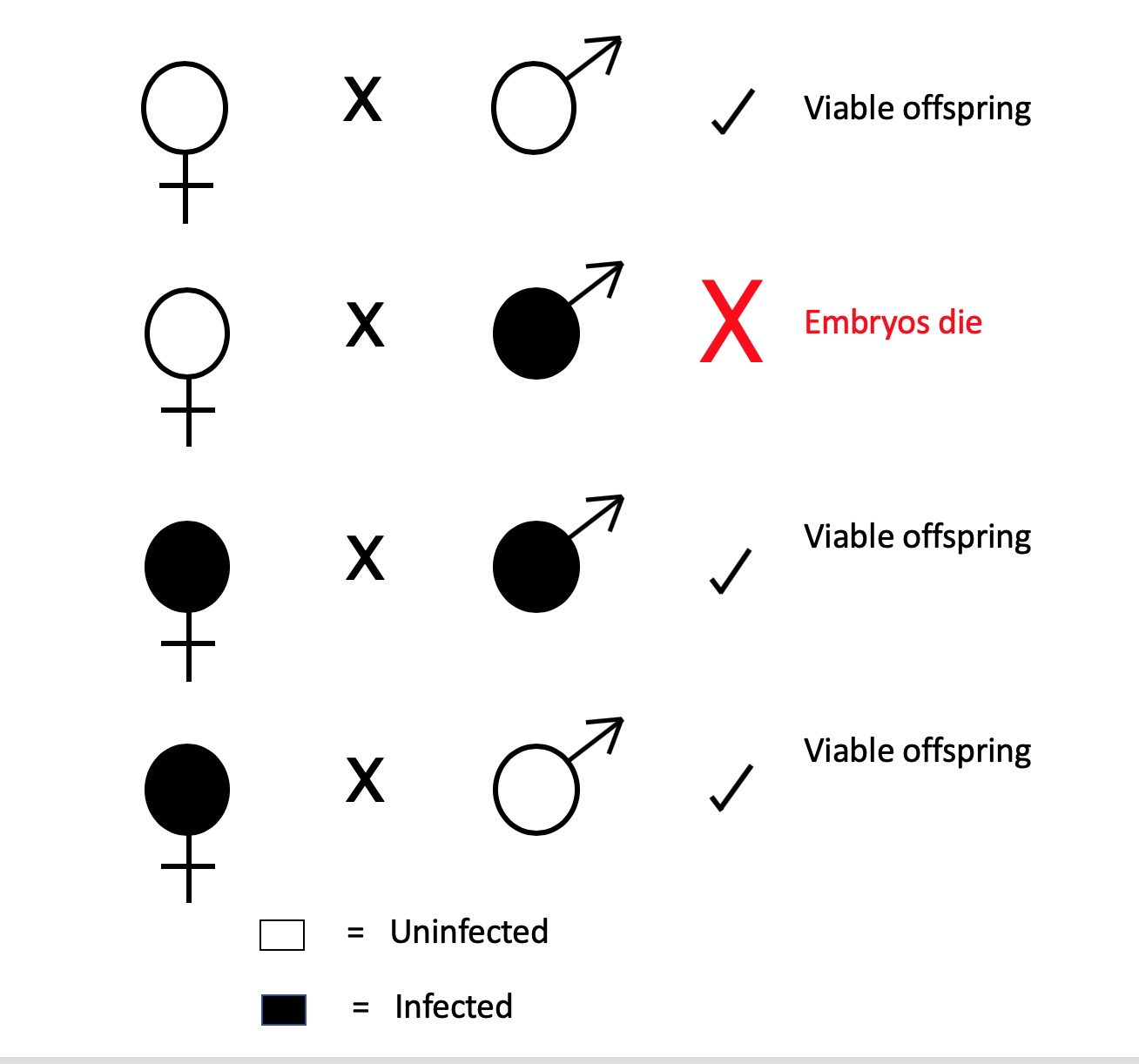 The first Wolbachia-related problem he applied those skills to is something called cytoplasmic incompatibility (CI), one of the ploys Wolbachia uses to spread among insects. Wolbachia is transmitted hereditarily via insects’ eggs, so the more Wolbachia-infected females there are, the more the bacteria propagate. Wolbachia helps things along by turning infected males into a form of selective birth control. When these males mate with uninfected females, the pairing is sterile. Infected females, on the other hand, can reproduce successfully with any male, infected or not. With this big advantage in the mating game, Wolbachia-carrying females outbreed their competition and can quickly take over populations.