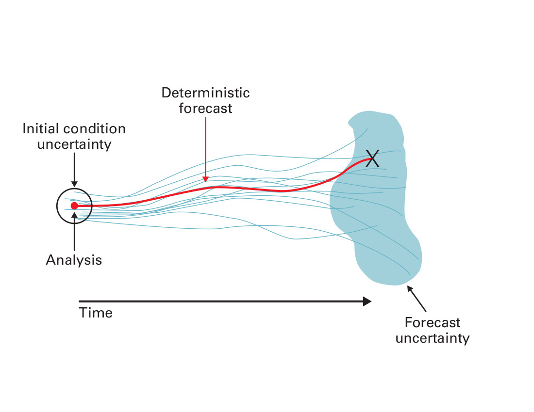 Weather forecasters know this, and they have a kludgy work-around. “They sample the weather in five or ten initial conditions and push each through the equations,” Venturi said. “Based on the outcome, they might say there is a 30 percent chance of rain. That just means that three simulations out of ten produced rain.”