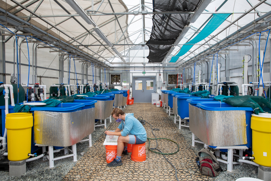 In 2011, Philpott eagerly applied for and accepted a job opening for an agroecologist with the Environmental Studies Department and the center. She admired the farm and its legacy and reputation for operating with a holistic view of agriculture—one, she said, that considers ecological and economic sustainability along with social justice and equity in the food system. “At UCSC, we have the reputation for thinking about transformation, and doing things differently than at the big ‘ag’ schools,” she said. In one recent example of this ethos in play, fishery experts Anne Kapuscinski and Pallab Sarker, both professors in environmental studies, designed and built an innovative facility right on the farm to study sustainable systems that closely integrate aquaculture with agriculture.