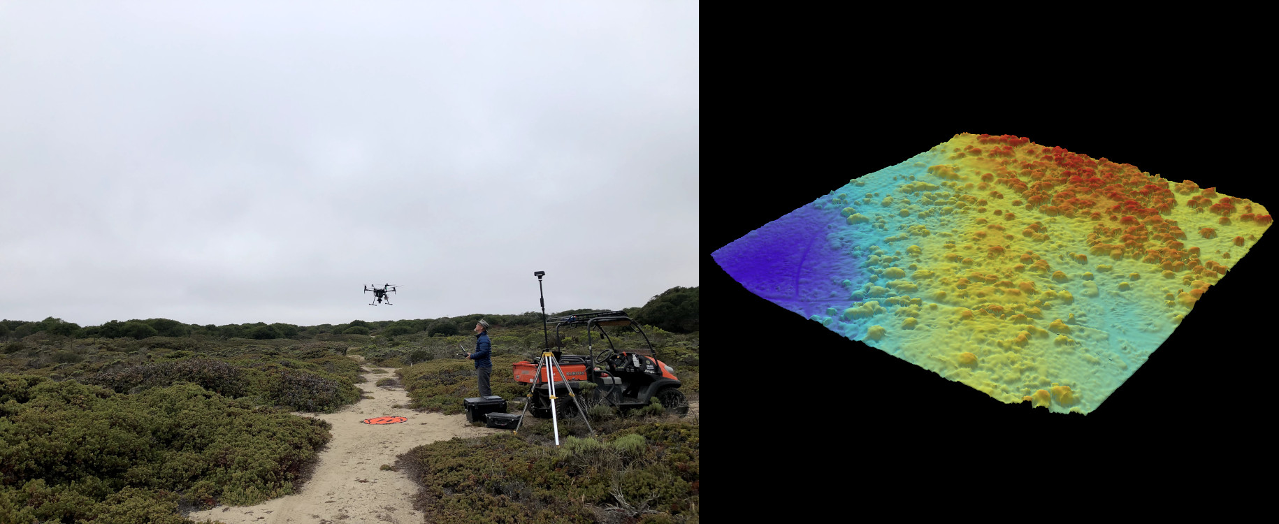 The drone that replaced Detka’s GoPro-topped pool sweep does much more than take photographs. Detka created a computer model that uses artificial intelligence (AI) and drone images to locate and collect data on the specific plants he studies amongst the dense coastal shrubbery. “Just like Facebook uses AI algorithms to recognize friends’ faces, I’ve trained a computer model to recognize plants,” Detka said. “The drone sees things we can’t, like in the near infrared spectrum, which is really important for plant identification,” he said. “I can actually use the drone to identify shrub species and classify the health of plants in the landscape.”